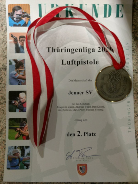 Angetreten sind die Schützen Josephine und Andreas Weise, Bert Kunze, Jörg Schiller, Mario Pforr und Stephan Sonntag. Ein 2:3 gegen Gotha und ein krachendes 4:1 gegen Elxleben reichte für die Jenaer Schützen, um in der Gesamtwertung den Vizemeistertitel hinter Suhl zu erringen. Nach uns reihten sich Gotha auf Platz 3 sowie Saalfeld und Elxleben auf den weiteren Platzierungen ein. Das ist für unser erstes Ligajahr weitaus mehr, als geplant war. Auch einige Mannschaftsgegner mussten sich eingestehen, dass ihre Rechnung nicht aufging….