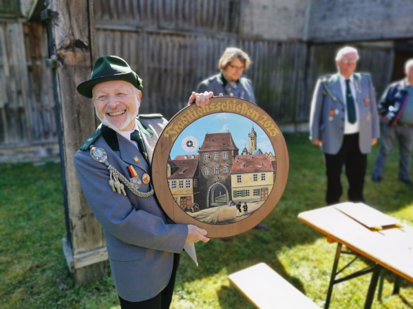 Bei sonnigem Wetter trafen sich die festlich gekleideten Mitglieder des Jenaer Schützenvereins Erlkönig mit den Gästen der Hauptschützengesellschaft Erlangen im Jenaer Schützenhaus. Matthias Kühm konnte seinen Schuss am nächsten beim vorgegebenen Zielpunkt platzieren. Damit hat er die Scheibe formal gewonnen. Sie wird mit seinem Namen versehen und im Schützenhaus ausgestellt.