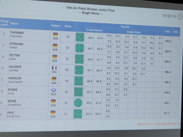 Bei diesem Wettkampf schoss Josi erst das zweite Finale überhaupt und das noch vor einem großen Publikum. Im Finale beginnen alle Schützinnen wieder bei 0. Es werden 2 Serien á 5 Schuss geschossen, bevor in den Einzelschussmodus im k.o.-Prinzip gewechselt wird. Hier wird dann jeder Schuss angesagt und nach jedem 2. Schuss scheidet die Schützin mit dem schlechtesten Ergebnis aus. Für Josi bedeutete Platz 7 am Ende dennoch ein sehr gutes Ergebnis. Es ist noch Luft nach oben vorhanden, insbesondere bis zur Deutschen Meisterschaft Ende August.