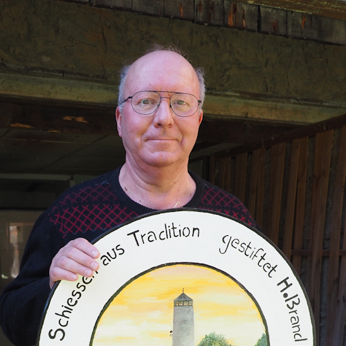 Das Wetter war auf unserer Seite und so konnte die Veranstaltung bei strahlendem Sonnenschein stattfinden. Ca. 25 Mitglieder des Vereins und 2 Gäste von unserem Parterverein in Erlangen fanden sich ein, um die kunstvoll gestaltete Scheibe zu beschießen. Das Stiften einer Ehrenscheibe obliegt normalerweise dem amtierenden Vogelkönig, der diese angenehme Pflicht schon vor 2 Jahren erfüllt hat. Derzeit gibt es leider keinen Nachfolger und damit auch keine neue Ehrenscheibe. Daher war es für den Jenaer Schützenverein Erlkönig e. V. eine Freude, dass unser Schützenfreund Helmut Brand diese Traditionsscheibe gestiftet hat. Das Motiv stellt den traditionsreichen Fuchsturm mit dem Fuchsturmhaus von Osten dar, der die Erinnerung an die drei ehemaligen Hausbergburgen wach hält.