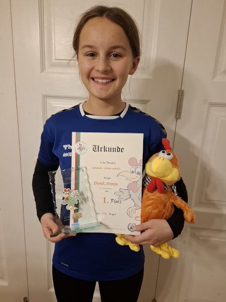 Als Vorjahresvierte angereist, wollte Svenja in diesem Jahr endlich den "Gockel" nach Jena holen. Demzufolge waren die Erwartungen hoch. Allerdings war der Anfang des Wettkampfes holprig und die Ergebnisse lagen zunächst unter den gesetzten Erwartungen. Später folgte eine wahnsinnig starke Aufholphase, in der Svenja nacheinander 5x in den 10er-Ring traf. Bei den 20 Wertungsschüssen landeten 7 in der Scheibenmitte. Zum Schluss erreichte sie (nur) 172 Ringe und landete trotzdem auf Platz eins vor vier starken Frankfurtern.