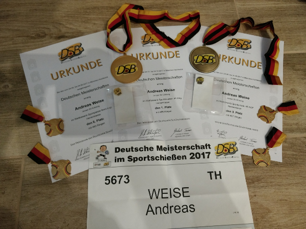 Bei den diesjährigen nationalen Meisterschaften des Deutschen Schützenbundes durfte ich neben der Bronzemedaille (nach gewonnener Stechserie) in der Disziplin Sportpistole .45 ACP in der Disziplin Sportrevolver .44 Magnum auf die oberste Stufe des Siegerpodestes steigen und als Schütze des Jenaer SV-Erlkönig e.V. die goldene Medaille empfangen. Dies ist nach dem Erfolg 2016 in der Disziplin Sportpistole .45 ACP meine zweite Goldmedaillie.
