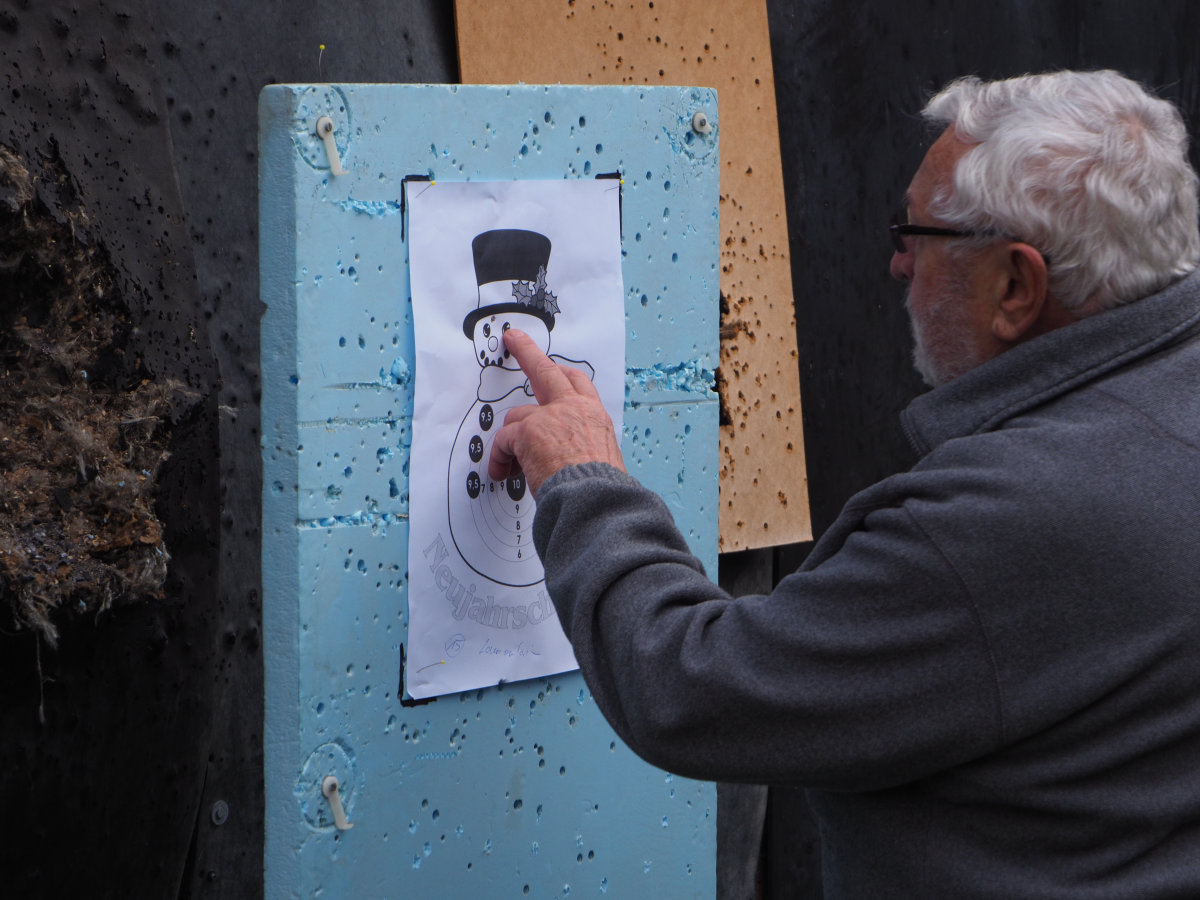 Hier stand weniger das Austragen eines sportlichen Wettkampfes im Vordergrund. Vielmehr galt es, die Geselligkeit zu pflegen. So wurde auch nicht auf die klassische 10er-Ringscheibe geschossen. Dem Anlass entsprechend wurde die Scheibe als Schneemann gestaltet. Neben den üblichen Ringen wurden auch drei Bereiche markiert, die dem Schützen Bonuspunkte bescherten. Alle 21 Teilnehmer gaben mit der selben Waffe drei Schuss ab. Die Aufgabe war nicht trivial. Bei 6 Teilnehmern gingen alle Schüsse daneben. Auch bei den anderen Schützen waren die Treffer weit über die Scheibe verteilt – meist außerhalb der Ringe. Nur bei 4 Schützen konnten Ringe gezählt werden, wobei hier – dank der Bonusringe – gleich 3x 9,5 Ringe gezählt werden konnten. Die Platzierung erfolgte nunmehr anhand des Trefferbildes. Hier konnte Volker Helmig den besten Treffer für sich verbuchen, gefolgt von Heinrich Wendehorst und Günther Queisser. Die Sieger erhielten – saisonal bedingt – tiefgefrorene Gänse als Preise.